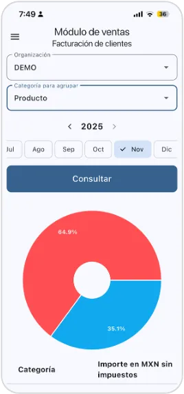 Facturación de clientes: Da seguimiento a tu facturación para identificar de dónde provienen tus mayores ingresos, ya sea por categoría de clientes, centro de costos, categoría de productos, producto o proyecto.