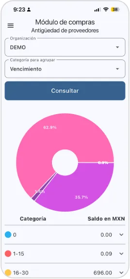 Antigüedad de proveedores: Identifica de forma inmediata los saldos vencidos y próximos a vencer para priorizar pagos y evitar presiones innecesarias de los proveedores.