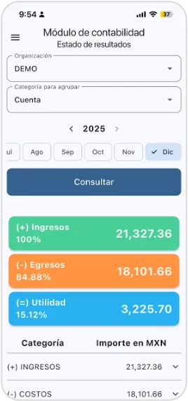 Estado de resultados: Consulta el resultado del negocio por periodo para entender ingresos, costos y gastos, identificar variaciones relevantes y contar con una referencia clara al momento de explicar el desempeño de la operación.